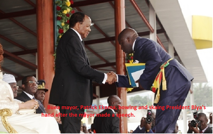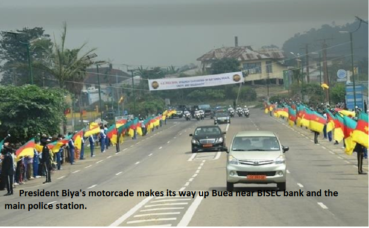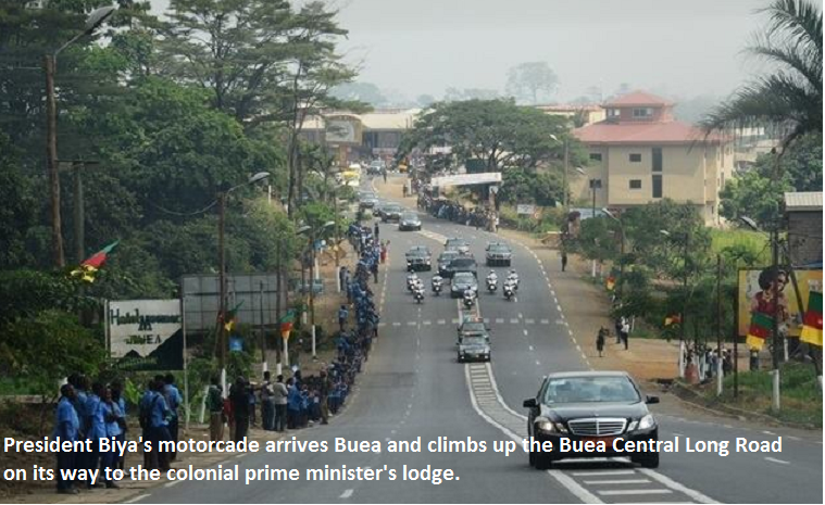 After saluting the population, the president of the republic started his speech in English in the following words “At long last, here we are in Buea! Here we are in Buea to celebrate the 50th anniversary of our re-unification. As the English people say, BETTER LATE THAN NEVER. In fact, after a long period of preparation, we are finally glad to be here in this historic town of Buea, the town of LEGENDARY HOSPITALITY. I am glad to be in Buea, the bedrock of our re-unification. History has not forgotten that Buea was the headquarters of West Cameroon. History has not forgotten that Buea was the capital of Southern Cameroons. And history has not forgotten that Buea was once the capital of German Cameroon. That is why I say that Buea is a historic town”.