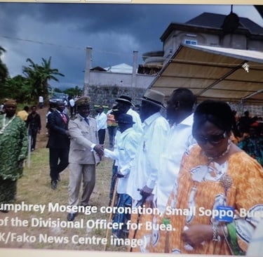 Small Soppo Buea, was on Saturday 25 February 2012 the venue of one of the most colourful, sophisticated, thrilling and expensive coronations ever witnessed in Cameroon. It was the enthronement of Humphrey Tande Mosenge as Chief of Small Soppo Wonganga to fill the chieftaincy stool that had remained vacant since the death of Chief Peter Moki Efange in 2006.